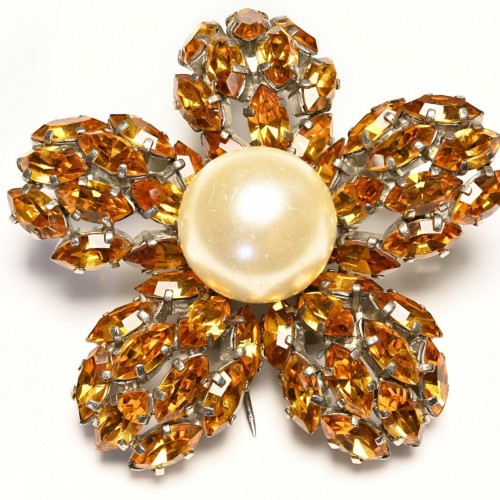 Cristobal Balenciaga by Roger Jean-Pierre Paris 1950’s Brown Crystal Pearl Flower Brooch