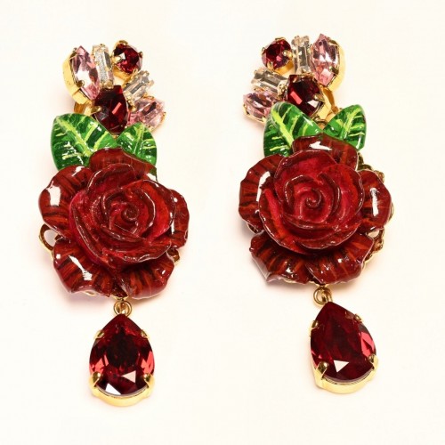 Dolce & Gabbana Red Green Resin Rose Flower Pink Crystal Earrings