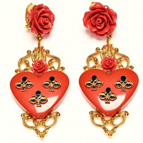Dolce & Gabbana Red Rose Heart Black Enamel Fleur de Lis Long Earrings