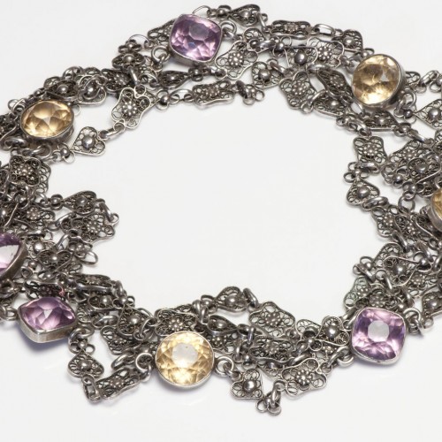 Antique 1900 Sterling Silver Pierced Chain Amethyst Citrine Sautoir Necklace