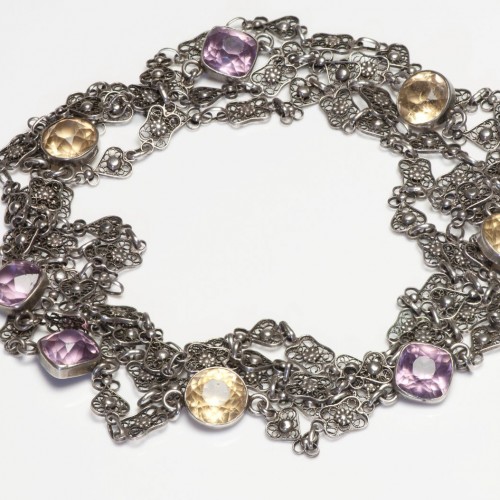 Antique 1900 Sterling Silver Pierced Chain Amethyst Citrine Sautoir Necklace