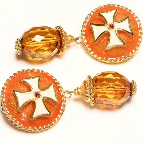 Vintage Gerard Yosca Maltese Cross Orange White Enamel Crystal Drop Earrings