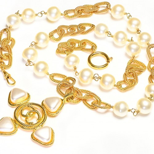 Chanel Paris 1990’s Gold Plated CC Cross Pearl Chain Pendant Necklace