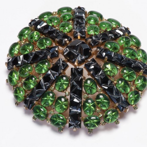 Vintage Marvella Green Black Cabochon Glass Crystal Large Flower Brooch