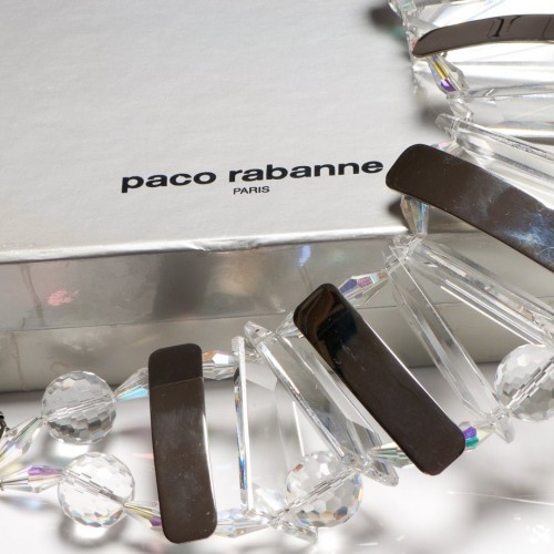 Vintage Paco Rabanne Paris Wide Silver Tone Metal Glass Crystal Choker Necklace