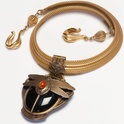 Vintage Patrice Black Orange Glass Dragonfly Pendant Necklace