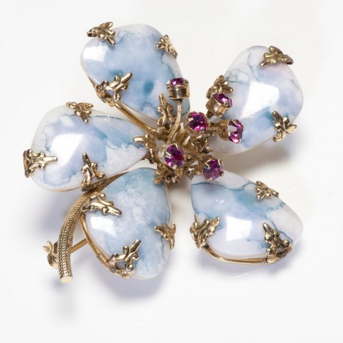 Vintage Schreiner NY 1950’s Blue Marbleized Stone Pink Crystal Flower Brooch