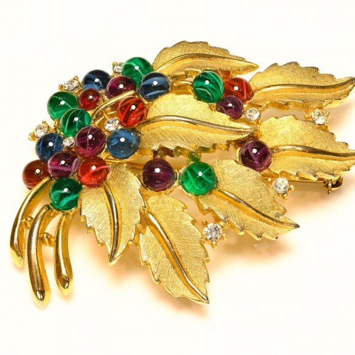 Vintage Trifari Red Green Blue Glass Jewels of India Leaf Brooch