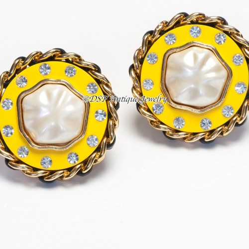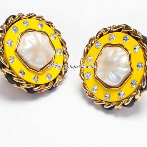 Chanel Paris Fall 1991 Yellow Resin Pearl Crystal Leather Chain Earrings
