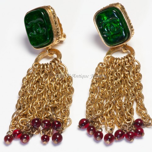 CHANEL Paris Fall 1993 Gripoix Red Green CC Glass Tassel Earrings