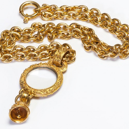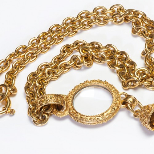 Chanel Paris Fall 1994 CC Gold Plated Magnifying Glass Bell Pendant Necklace