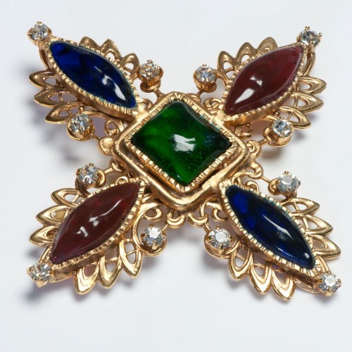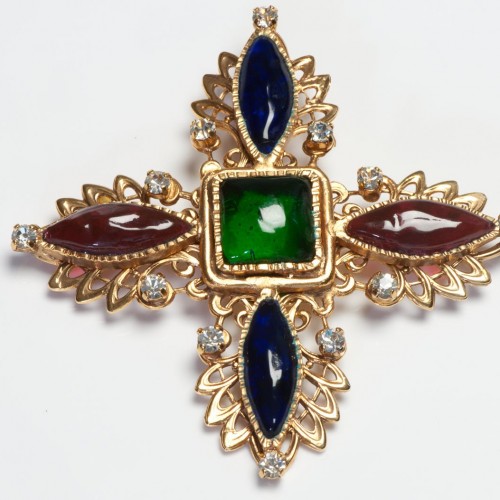 Chanel Paris Fall 1994 Gripoix Red Blue Green Glass Cross Pendant Brooch