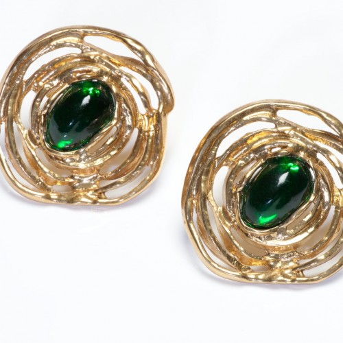 Vintage Yves Saint Laurent Large Gold Plated Green Cabochon Swirl Earrings