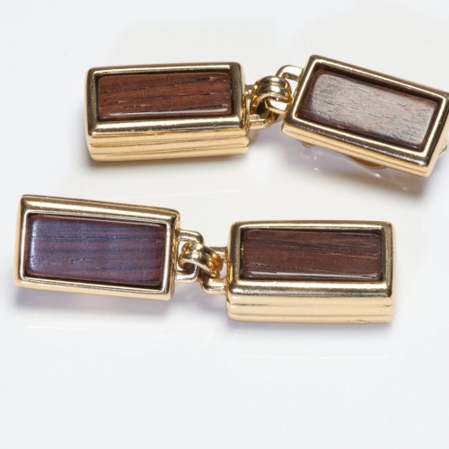 Vintage Yves Saint Laurent Long Gold Plated Brown Wood Earrings