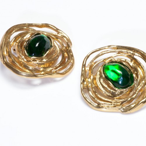 Vintage Yves Saint Laurent Large Gold Plated Green Cabochon Swirl Earrings
