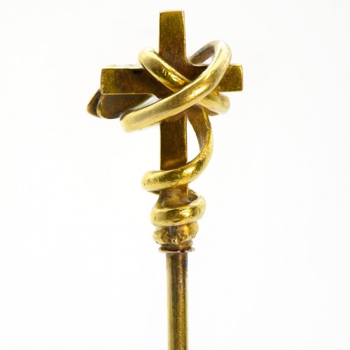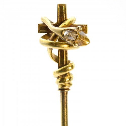 Victorian Snake & Cross Stickpin – 14K Gold with Rose Cut Diamond