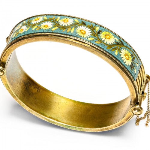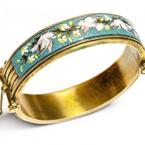 Victorian Silver Mosaic Bangle Bracelet with Flower and Bird Motif