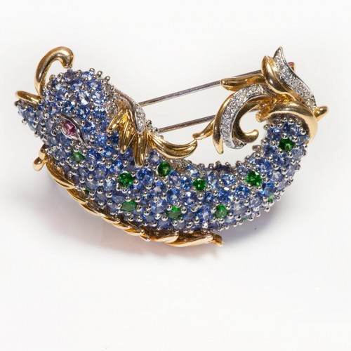 Vintage 18K Gold Sapphire Diamond Tsavorite Stylized Dolphin Brooch