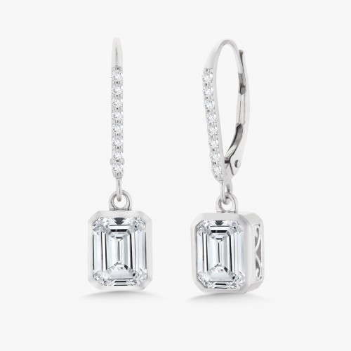 Bezeled Emerald Cut Diamond Dangle Earrings 3.12 ctw 14k White Gold