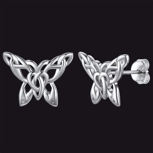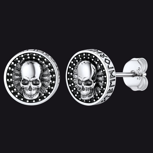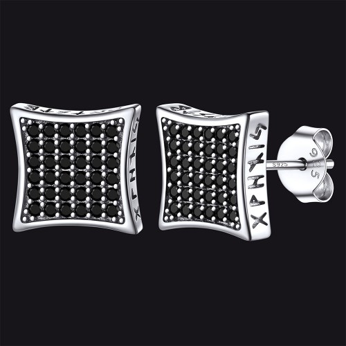 9mm Square Black Diamond Stud Earrings with Viking Runes Silver