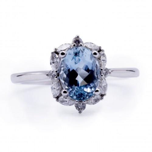 Natural Aqua Marine & Marquise with Round Diamond Halo Ring 14K White Gold
