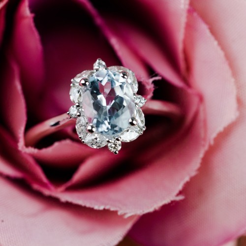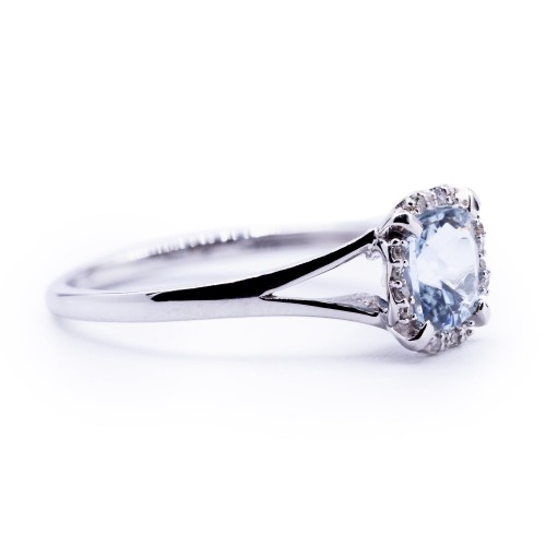 Natural Aqua Marine & Marquise with Round Diamond Halo Ring 14K White Gold