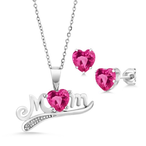 925 Silver `Mom` 1.81Ct Pink Created Sapphire White Diamond Pendant and Earrings Jewelry Set