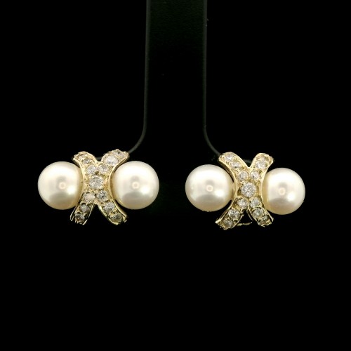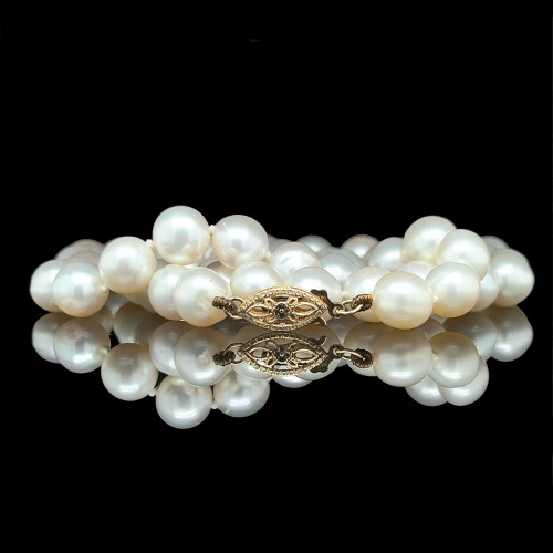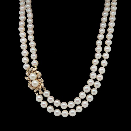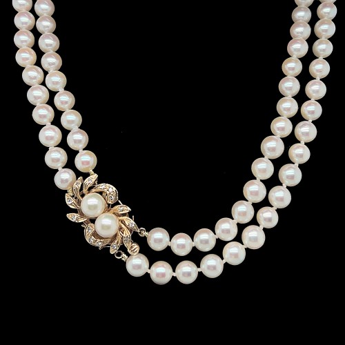 6.1-6.2mm Akoya Double Strand Cultured Pearl & Diamond Estate Necklace Yellow Gold – J40250