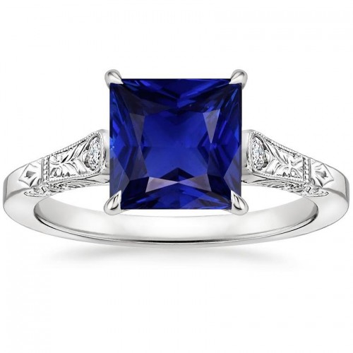 White Gold 3 Stone Natural Earth Mined Diamond & Princess Blue Sapphire Ring 5.25 Carats