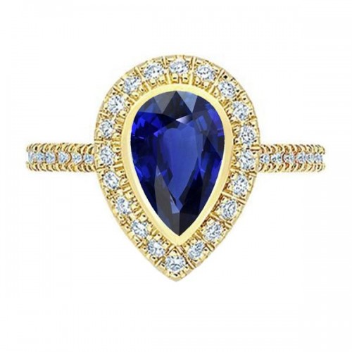 Yellow Gold Halo Pear Srilanka Sapphire Ring & Natural Earth Mined Diamonds 4 Carats