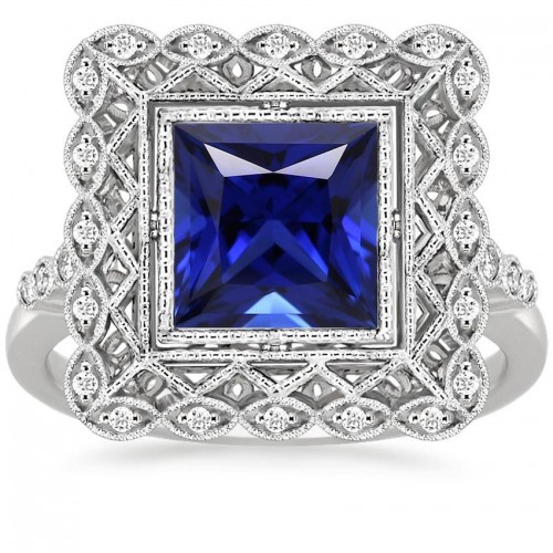Ladies Asscher Natural Earth Mined Diamond Ring Ceylon Sapphire 3 Stone Jewelry 2 Carats