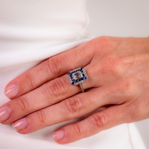 Art Deco style 1.14 carat heart sapphire diamond platinum bombe ring