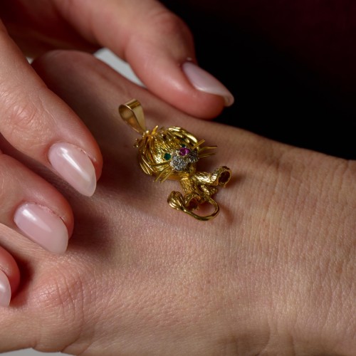 Mid Century diamond ruby emerald 18k yellow gold lion pendant