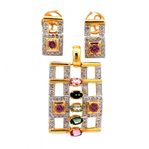 18K Two Tone Gold Pendant Earring Set With Natural Diamond & Multi Sapphire Jewelry