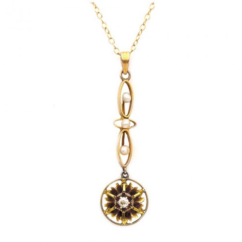 Art Nouveau Diamond and Seed Pearl Necklace in 10 Kt Yellow Gold