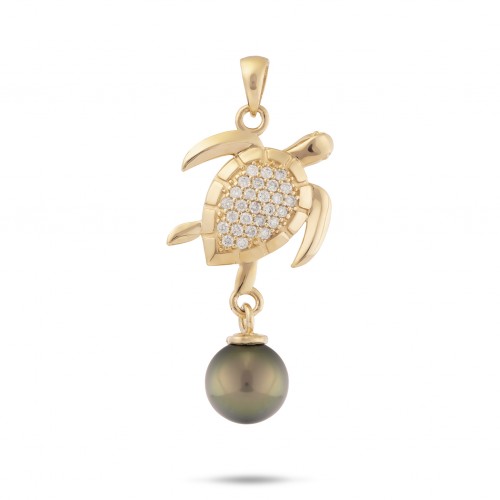 Ocean Dance Honu (Sea Turtle) Tahitian Black Pearl Pendant in Gold with Diamonds – 9-10mm