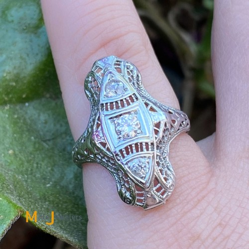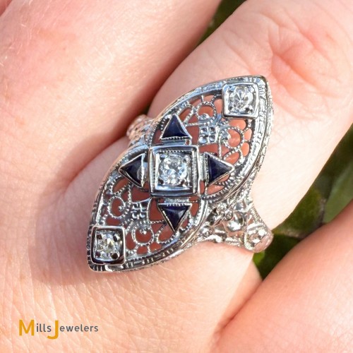 Vintage 18K White Gold Synthetic Blue Sapphire and 0.09ctw Diamond Art Deco Ring Size 6.5