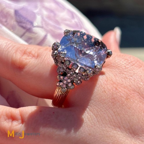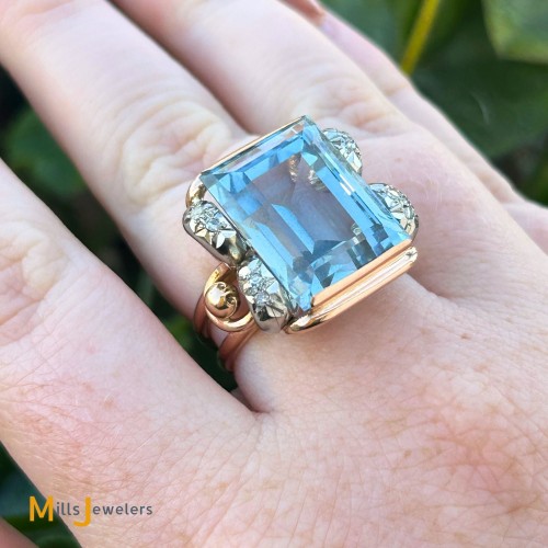Vintage 18K Two-Tone Rose & White Gold 16.37ct Aquamarine Diamond Cocktail Ring Size 7