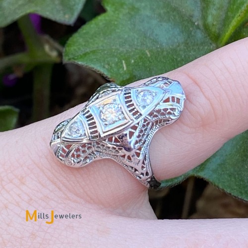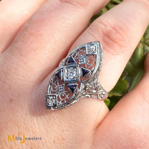 Vintage 18K White Gold Synthetic Blue Sapphire and 0.09ctw Diamond Art Deco Ring Size 6.5