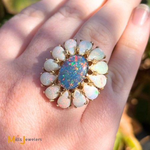 Vintage Signed 18K Yellow Gold Doublet Opal and Australian Fire Opal Cluster Cocktail Ring Size 6.75