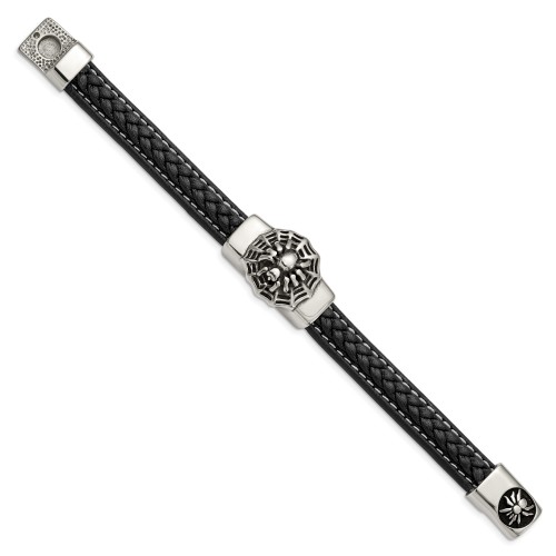 Chisel Stainless Steel Antiqued and Polished Spider Black Braided Faux Leather 8.5 inch Bracelet
