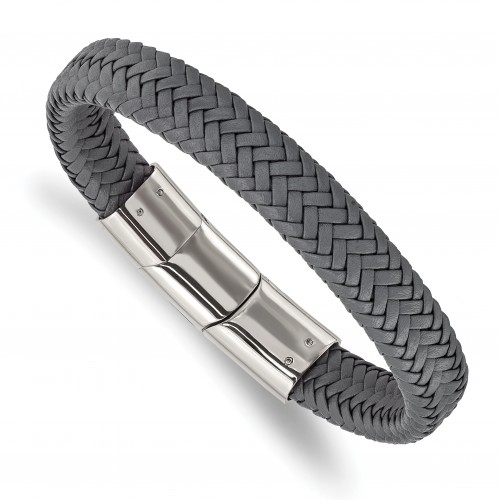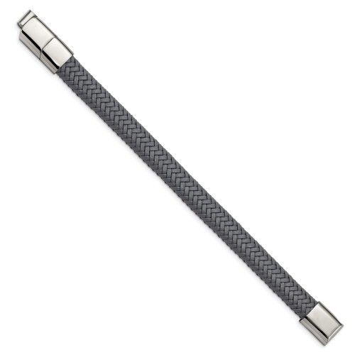 Chisel Stainless Steel Polished Grey Braided Leather 8 inch Bracelet with .5 inch Extension