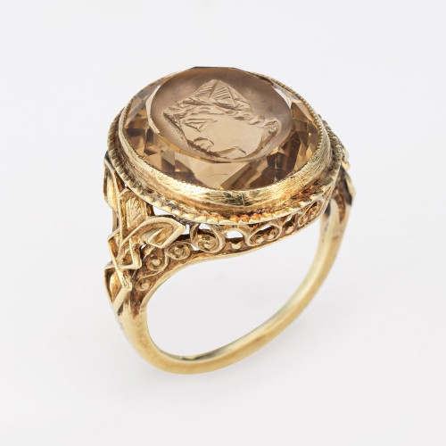 Vintage Art Deco Intaglio Ring Smoky Quartz Bust 14k Yellow Gold Oval Jewelry