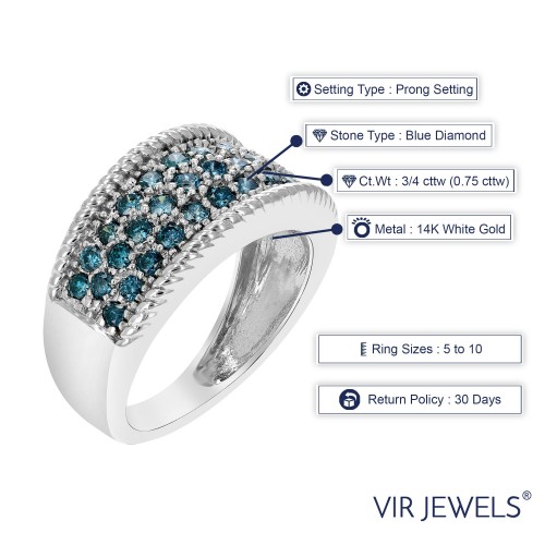 3/4 cttw Milgrain Blue Diamond Wedding Band in 14K White Gold 5.25