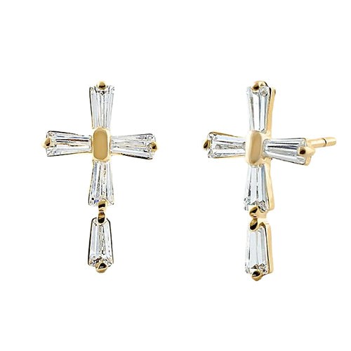 Solid 14K Yellow Gold Clear Baguette Straight Clear CZ Cross Pendant