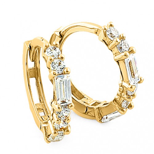 Solid 14K Yellow Gold Round & Baguette Straight CZ Hoop Earrings
