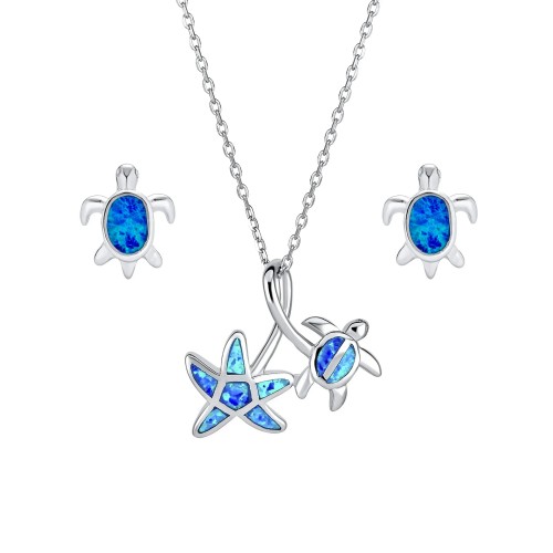 Nautical Beach Opal Sea Turtle Earrings and Starfish Necklace Jewelry Set Silver