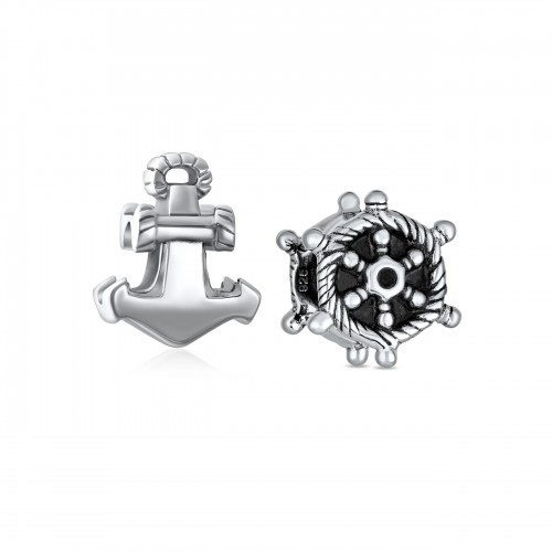 Set of 2 Nautical Boat Ship Wheel and Anchor Rope Charm Bead Sterling Silver