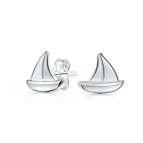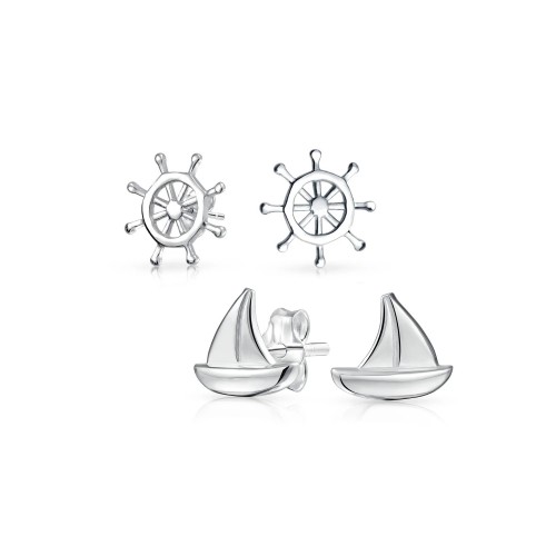 Set of 2 Small Nautical Sail Boat and Ship Wheel Stud Earrings Sterling Silver
