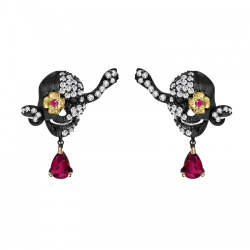 This pendant necklace features a 0.9 ct ruby gemstone set in a 925 sterling silver base enhanced with black rhodium plating. The main ruby measures 5x7mm, complemented by synthetic ruby side stones and diamond accents. The total silver weight is 3.94g, combining elegance with a bold death skull design.